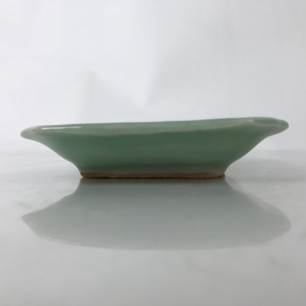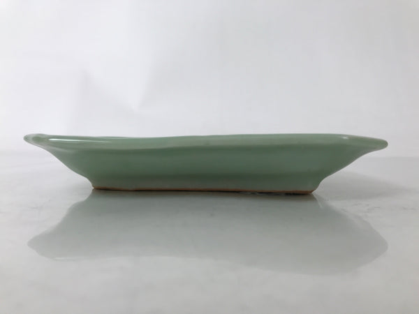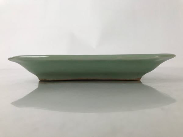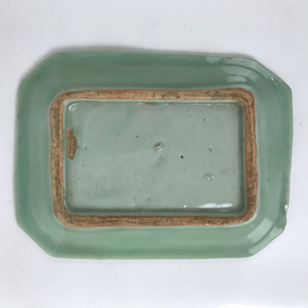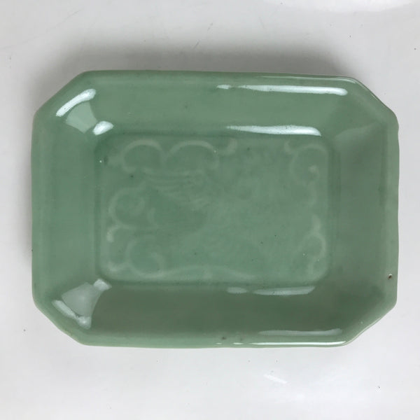 This is an antique Japanese ceramic pottery plate. This rectangular small-sized plate, also called sara or kozara, was made by hand and has a beautiful celadon green glaze with a subtle image of Ho-oh, a legendary bird motif often used in Buddhist art and architecture. The glaze has a smooth texture throughout. This item is perfect for small side dishes, condiments, dipping sauces, or holding small jewelry or keys.