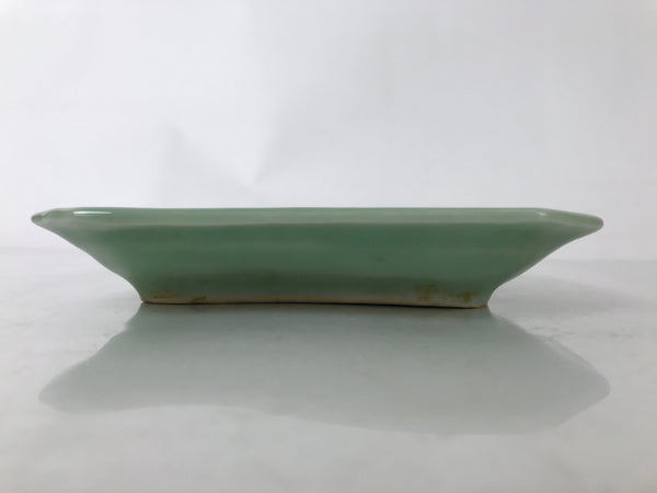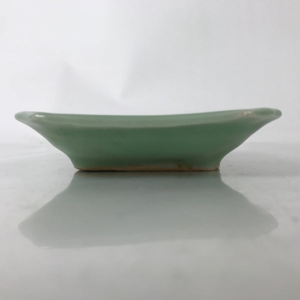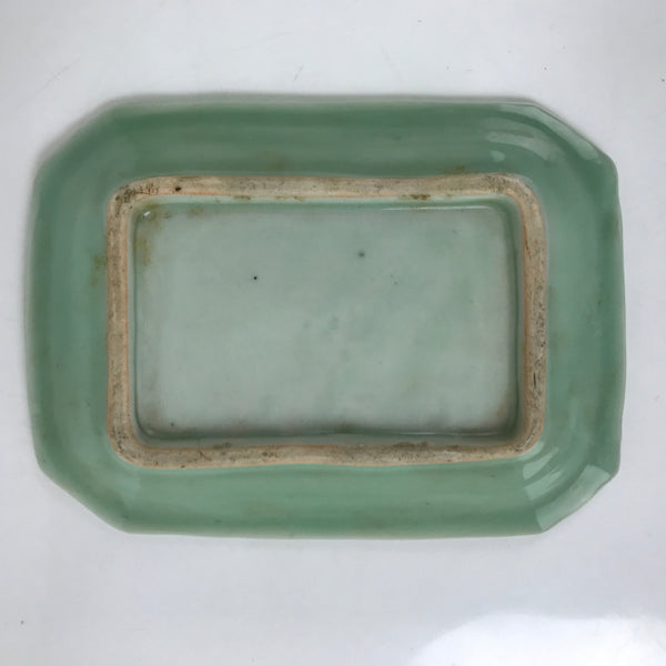 This is an antique Japanese ceramic pottery plate. This rectangular small-sized plate, also called sara or kozara, was made by hand and has a beautiful celadon green glaze with a subtle image of Ho-oh, a legendary bird motif often used in Buddhist art and architecture. The glaze has a smooth texture throughout. This item is perfect for small side dishes, condiments, dipping sauces, or holding small jewelry or keys.