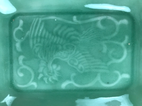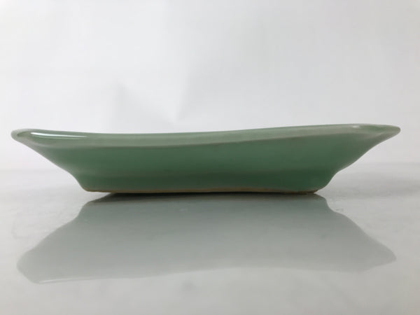 This is an antique Japanese ceramic pottery plate. This rectangular small-sized plate, also called sara or kozara, was made by hand and has a beautiful celadon green glaze with a subtle image of Ho-oh, a legendary bird motif often used in Buddhist art and architecture. The glaze has a smooth texture throughout. This item is perfect for small side dishes, condiments, dipping sauces, or holding small jewelry or keys.