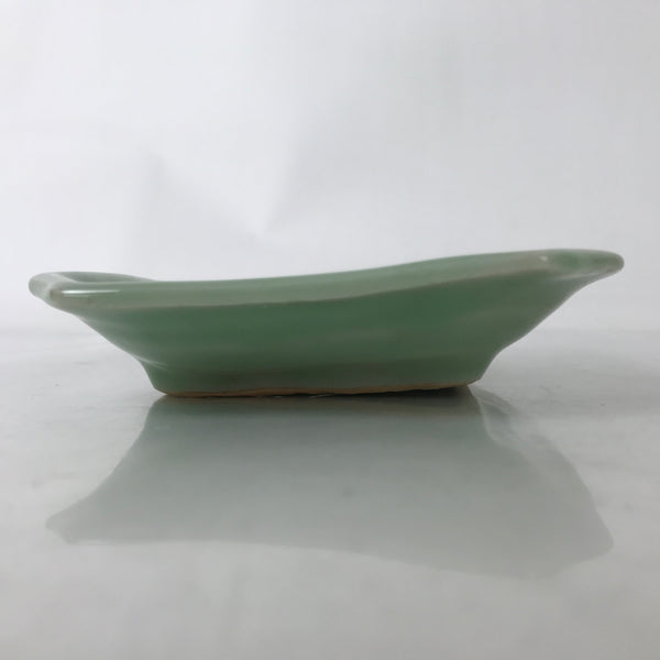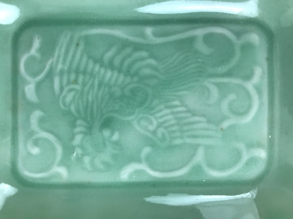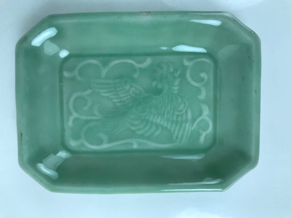 This is an antique Japanese ceramic pottery plate. This rectangular small-sized plate, also called sara or kozara, was made by hand and has a beautiful celadon green glaze with a subtle image of Ho-oh, a legendary bird motif often used in Buddhist art and architecture. The glaze has a smooth texture throughout. This item is perfect for small side dishes, condiments, dipping sauces, or holding small jewelry or keys.