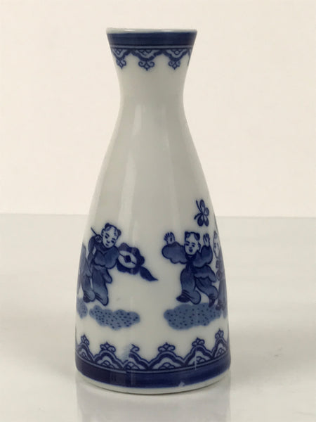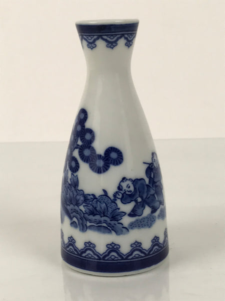 This is a vintage Chinese porcelain sake bottle or Tokkuri. This small bottle features children playing in Tang-style clothing (also called karako in Japanese). The bottle is mostly white with blue designs and borders. It is approximately an ichi-go size sake bottle or a little larger. It can also be used for water, other drinks, as a vase, or as a decorative item. There is a blue signature on the bottom.