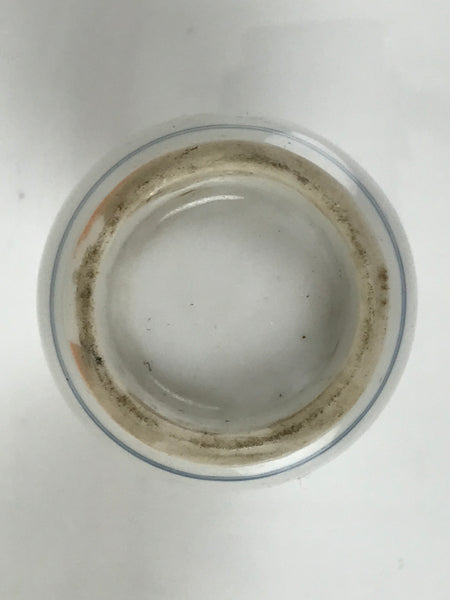 This is a Japanese vintage porcelain sake bottle or Tokkuri. This beautiful sake bottle is white with a blue gourd design and red Kanji letters. Thin blue bands are on the top and bottom. It is a compact size, making it easy to use daily for beverages or as a small flower vase.