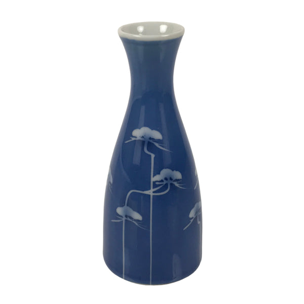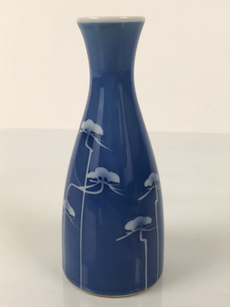 This is a Japanese vintage porcelain sake bottle or Tokkuri. This beautiful sake bottle is mostly a soft blue with white silhouettes of traditional depictions of pine trees. It is a compact size with a generous volume (roughly ichi-go), making it easy to use daily for beverages or as a small flower vase.