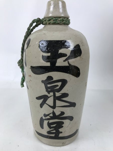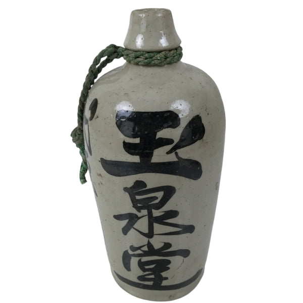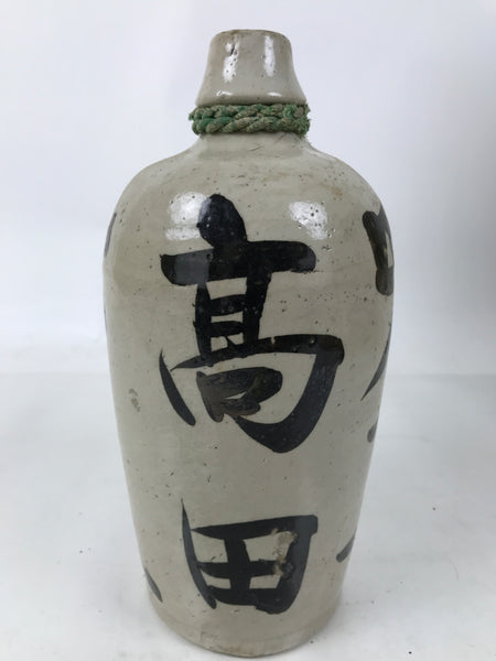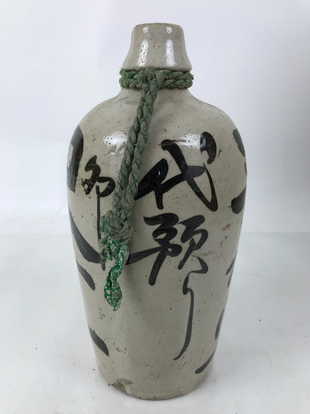 This is an antique Japanese ceramic sake bottle. It is called a Kayoi-Tokkuri and is used to pour sake. The commuting sake bottle became popular as a rental container for liquor stores in the Edo period when sake began to be consumed daily. This gray bottle has black characters and a green string.