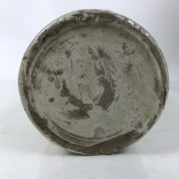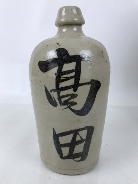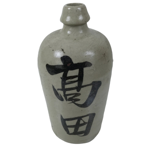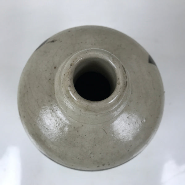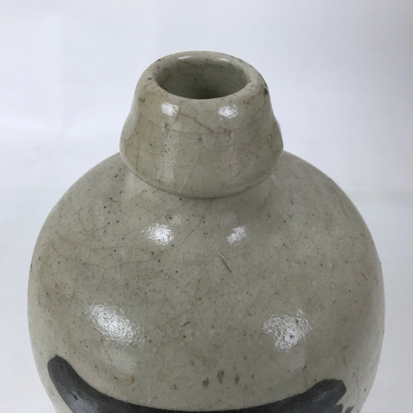 This is an antique Japanese ceramic sake bottle. It is called a Kayoi-Tokkuri and is used to pour sake. The commuting sake bottle became popular as a rental container for liquor stores in the Edo period when sake began to be consumed daily. This gray bottle has black characters and crackle glaze Kannyu on the body.