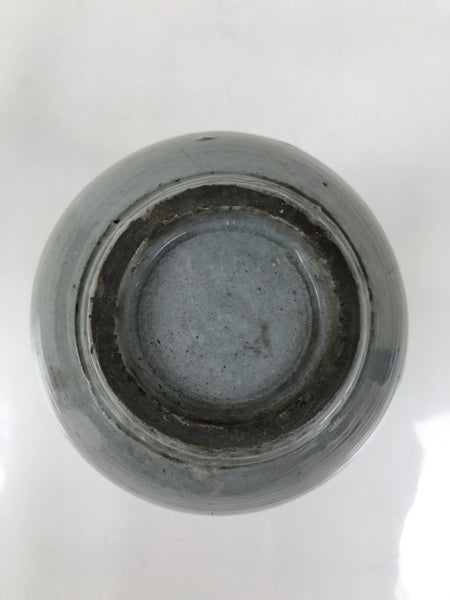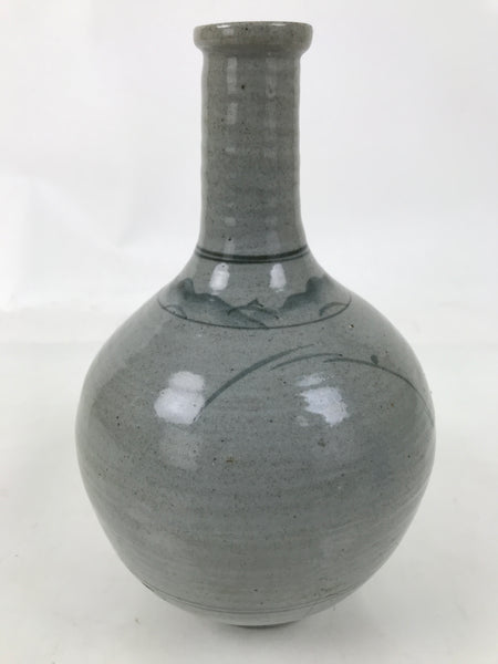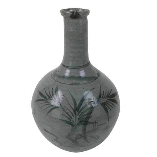 This is a vintage Japanese ceramic sake bottle. It is called a Kayoi-Tokkuri and is used to pour sake. The sake bottle for commuting became popular as a rental container for liquor stores in the Edo period, when sake began to be consumed daily. This grayish-blue bottle has a tree design on the front. The bottle is round with a long, narrow neck. There is a chip on the mouth.