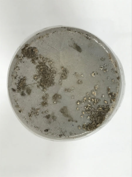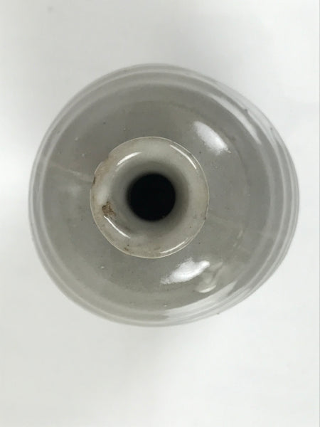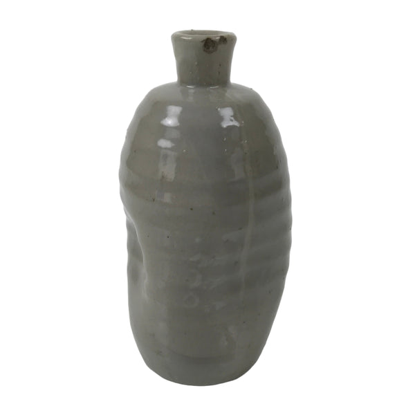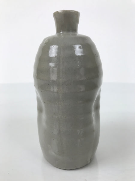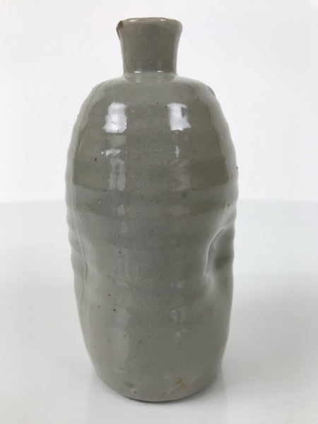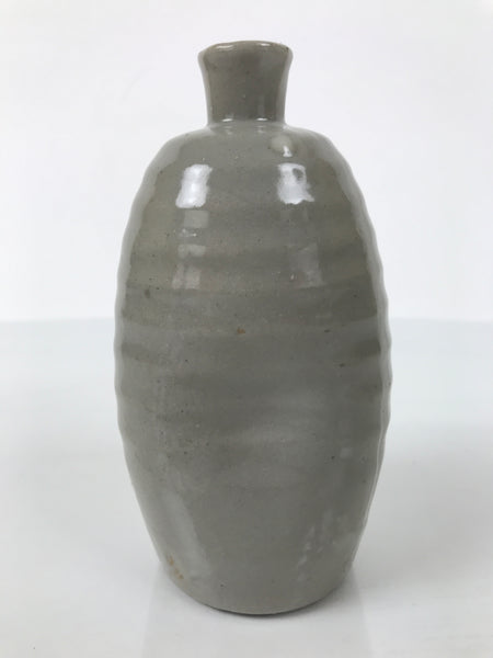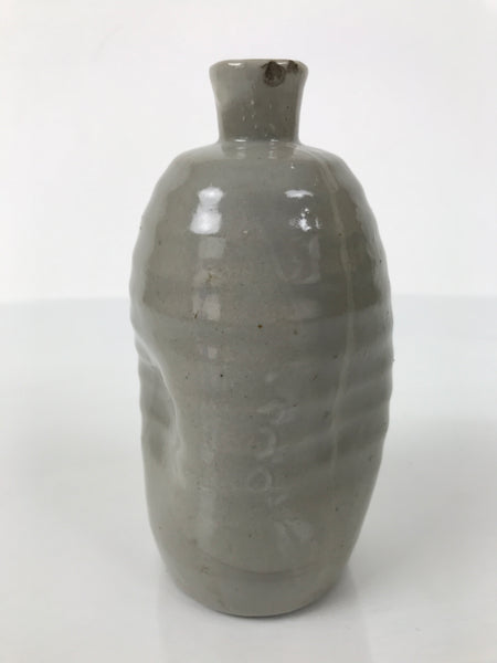 This vintage Japanese tokkuri ceramic sake bottle is a light gray color with a banded pattern/texture around the whole body. It has spots where it was pinched before firing to allow for an easy grip. The shape and simple style is reminiscent of the larger kayoi-tokkuri bottles used to transport and sell sake. This bottle is a beautiful addition to any collector's shelf, as its traditional design and aesthetic make it a timeless work of art.
