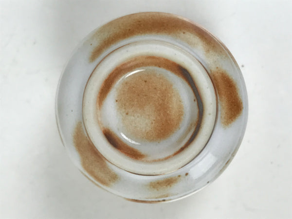 This is a vintage Japanese ceramic sake cup. This particular type of cup is called tsubomi or "bud type" due to its resemblance to a flower bud. In terms of size, it is also called ochoko. It has a white and brown, almost marbled, pattern, similar to Red Shino ware pottery.