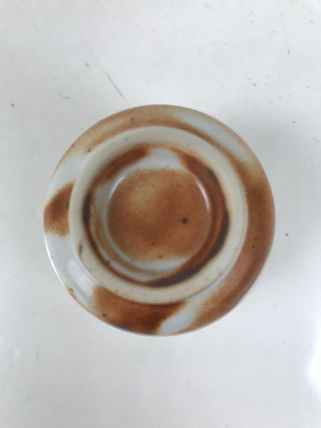 This is a vintage Japanese ceramic sake cup. This particular type of cup is called tsubomi or "bud type" due to its resemblance to a flower bud. In terms of size, it is also called ochoko. It has a brown and white, almost marbled, pattern, similar to Red Shino ware pottery.