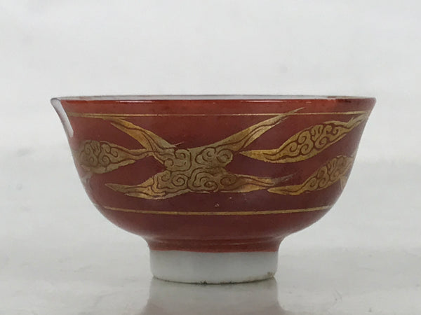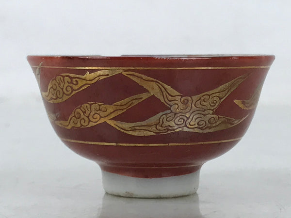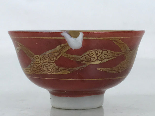This is a vintage Kutani Ware Japanese porcelain sake cup. This particular type of cup is called tsubomi or "bud type" due to its resemblance to a flower bud. In terms of size, it is also called ochoko. This unique cup features a shunga scene, erotic art made famous by woodblock print (ukiyoe) artists. It is hand-painted with a variety of colors, including a shining gold. The outside of the cup is red with gold designs.