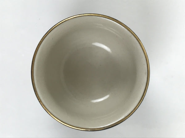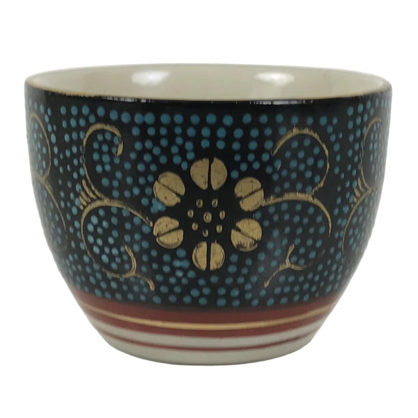 This is a vintage Japanese Kutani porcelain sake cup. This particular type of cup is called tsubomi or "bud type" due to its resemblance to a flower bud. In terms of size, it is also called ochoko. This beautiful imari sake cup is fully decorated with precise gold linework of flowers and vines on a raised-texture blue dotted background. There is a red and gold banded line near the base for one extra touch of color. The inside is solid white. It has the Kutani marking on the bottom.