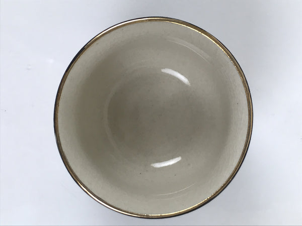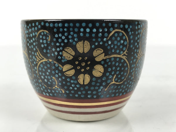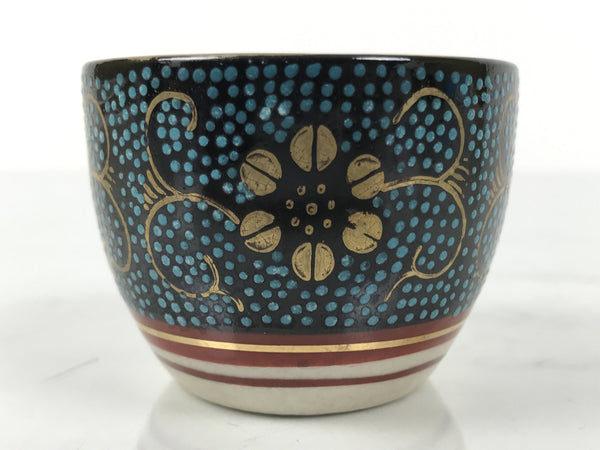 This is a vintage Japanese Kutani porcelain sake cup. This particular type of cup is called tsubomi or "bud type" due to its resemblance to a flower bud. In terms of size, it is also called ochoko. This beautiful imari sake cup is fully decorated with precise gold linework of flowers and vines on a raised-texture blue dotted background. There is a red and gold banded line near the base for one extra touch of color. The inside is solid white. It has the Kutani marking on the bottom.