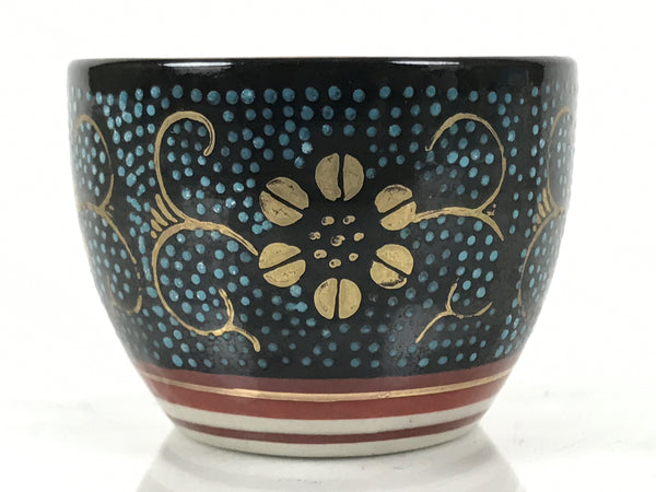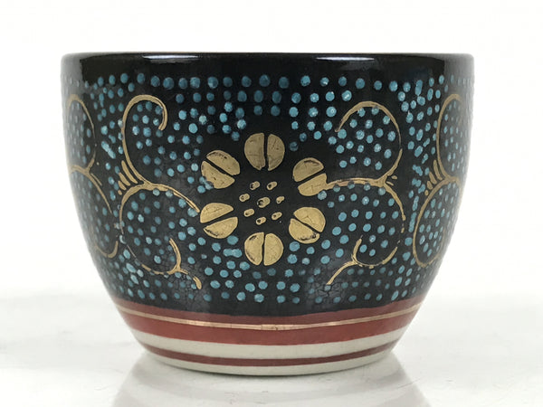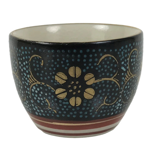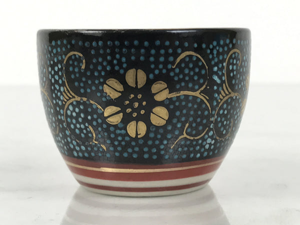 This is a vintage Japanese Kutani porcelain sake cup. This particular type of cup is called tsubomi or "bud type" due to its resemblance to a flower bud. In terms of size, it is also called ochoko. This beautiful imari sake cup is fully decorated with precise gold linework of flowers and vines on a raised-texture blue dotted background. There is a red and gold banded line near the base for one extra touch of color. The inside is solid white. It has the Kutani marking on the bottom.