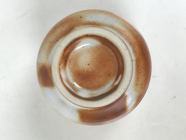 This is a vintage Japanese ceramic sake cup. This particular type of cup is called tsubomi or "bud type" due to its resemblance to a flower bud. In terms of size, it is also called ochoko. It has a brown and white, almost marbled, pattern, similar to Red Shino ware pottery.