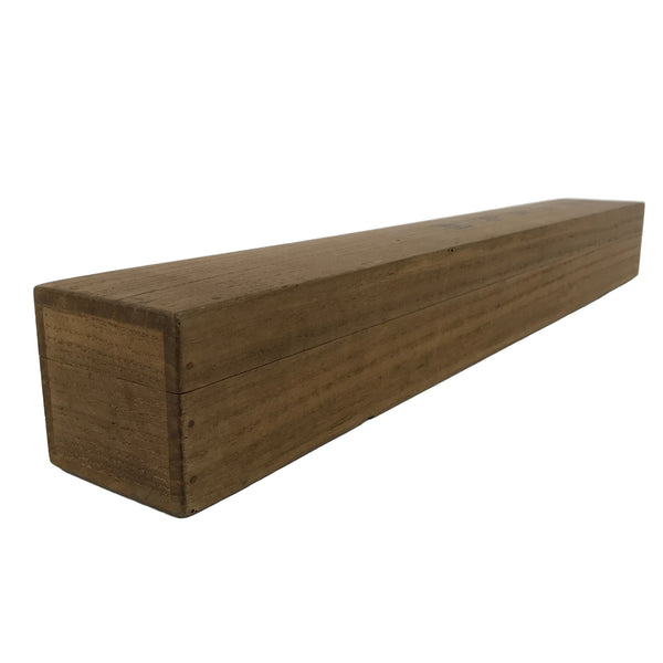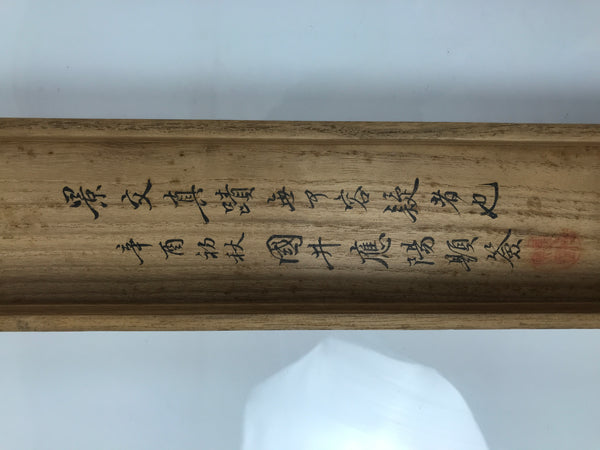 Hand-crafted and in a brown wood color, this sturdy, slender box is made to store a hanging scroll, or kakejiku. The lid fits flush on the top. It has two brackets inside the box to secure the scroll. This specific box has inscriptions on the top and the inside of the lid.