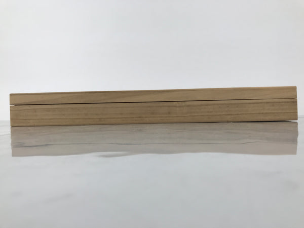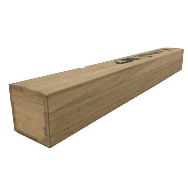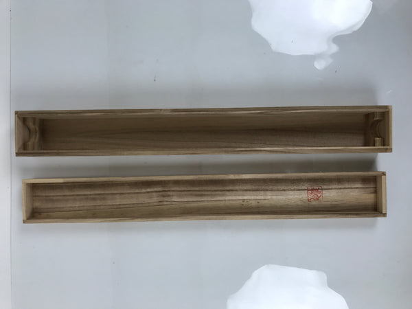 Hand-crafted and in a natural wood color, this sturdy, slender box is made to store a hanging scroll, or kakejiku. The lid fits flush on the top. It has two wooden brackets inside the box to secure the scroll. This specific box has inscriptions on the top and a red seal on the inside of the lid. There is a label on the lid.
