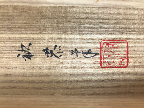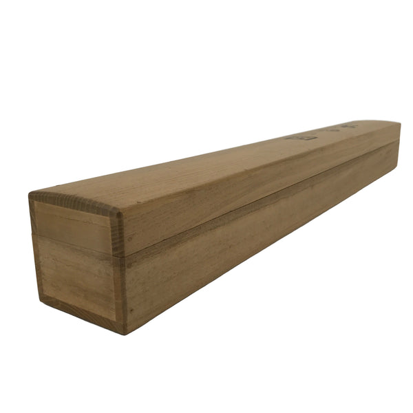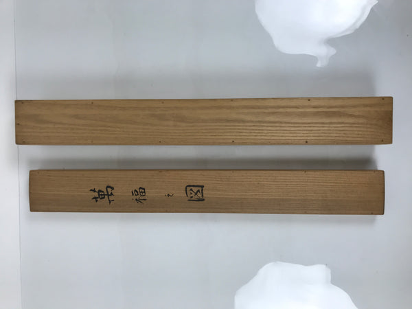 Hand-crafted and in a natural wood color, this sturdy, slender box is made to store a hanging scroll, or kakejiku. The lid fits flush on the top. It has two brackets inside the box to secure the scroll. This specific box has inscriptions on the top and the inside of the lid.