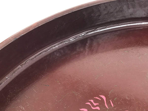 This is a vintage wooden serving tray, or obon. It is round with a raised edge. The tray is brown on the inside and outside edges, and has a textured black bottom on the outside. It features different-color marks, and some of them have a Kanji design that is likely a signature. It comes with the original paper box.
