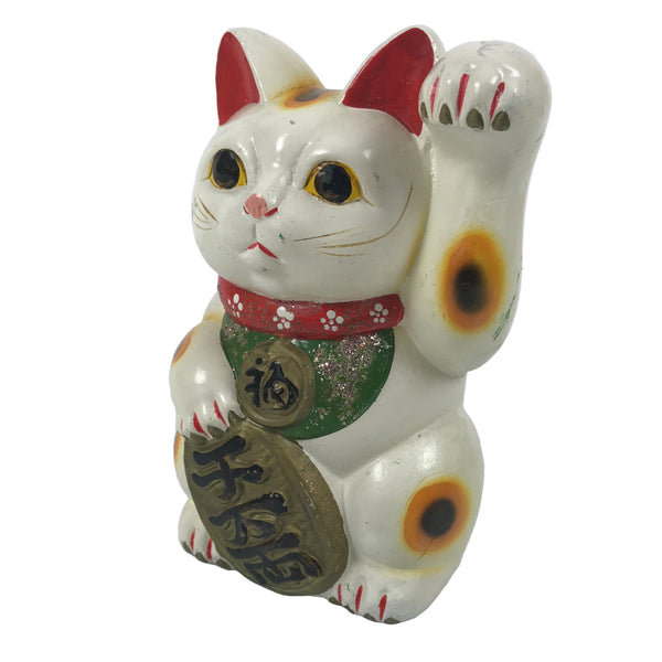 This is a vintage Japanese ceramic piggy bank in the shape of a maneki neko cat (beckoning cat). It is a white and orange calico cat with a red collar with a gold tag that says fuku 福, or "fortune" on it. It holds a koban gold coin that says sen man ryo, or "10 million ryo" on it. Ryo was a currency used during the Edo period. It has a slot at the back of the head to put coins.
