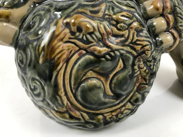 This is a ceramic guardian Shishi statue (foo dog). Glazed two shades of brown, this particular statue can also be called komainu or Shisa (Okinawa). They typically come in pairs, one with an open mouth (to frighten away evil) and one with a closed mouth (to keep the good spirits safe inside). This statue has an open mouth and poses with a ball with a mon symbol on the front side.