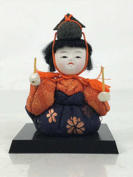 This Japanese vintage court musician hina ningyo doll dressed in an orange, navy blue, and gold kimono is the perfect addition to any existing hina set or adds gorgeous Eastern flair to any home decor. This doll is one of five court musician dolls called goninbayashi. They hold taiko drumsticks in each hand, ready to strike. This doll wears a black hat tied with an orange string and comes with a simple black resin stand. The doll is made in the kimekomi style, which is crafted by adhering and pressing silk fabric onto a craved wooden, resin, or clay base.