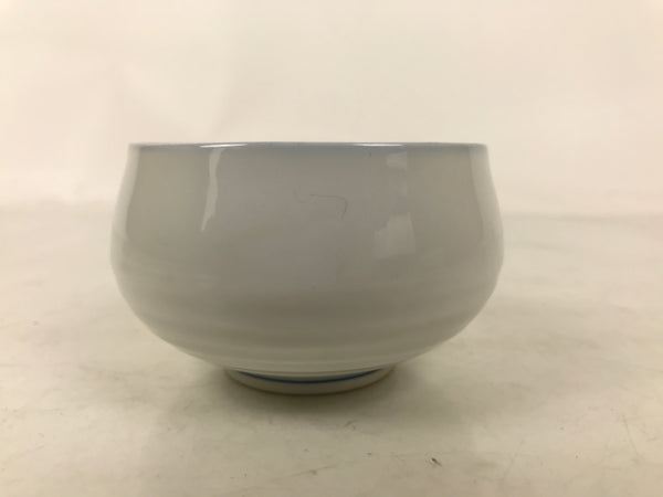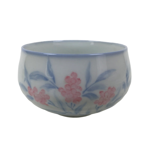 This is a Japanese vintage tea cup (Yunomi). It is in an Arita ware style with leaves and berries on the front. The cup is white, the leaves are blue, and the berries are pink. There is a thin blue line on the rim. It is signed on the bottom. This cup is for serving sencha (steeped loose leaf tea).