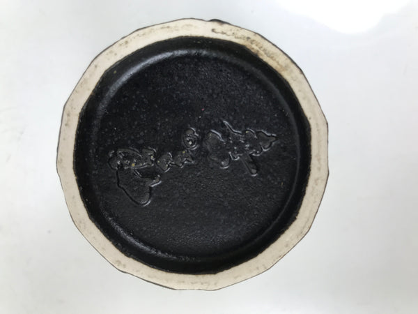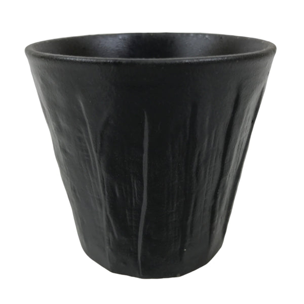 This vintage Japanese ceramic teacup is simple black with a slight line design on the sides. It is a larger yunomi cup that is great for holding with both hands.
