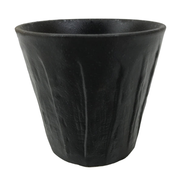 This vintage Japanese ceramic teacup is simple black with a slight line design on the sides. It is a larger yunomi cup that is great for holding with both hands.
