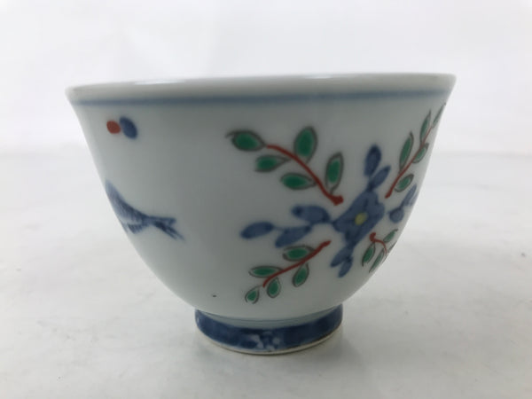 This vintage Japanese porcelain teacup is mostly white with a blue inside rim and foot. On the outside are painted images of water caltrop plants (hishi), a fish, and a small crab.