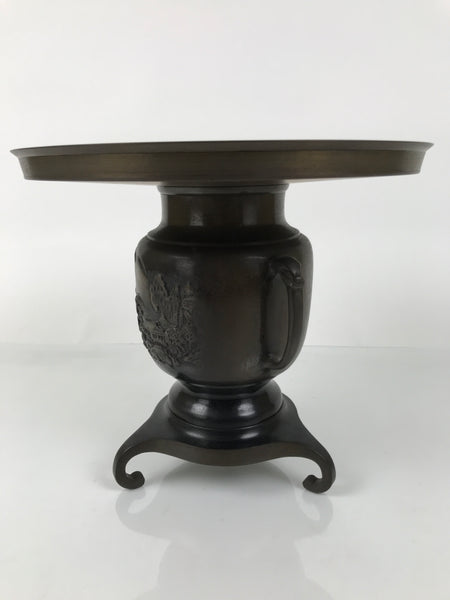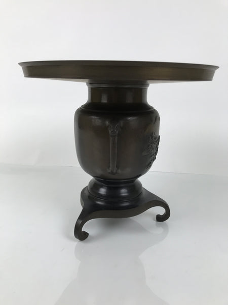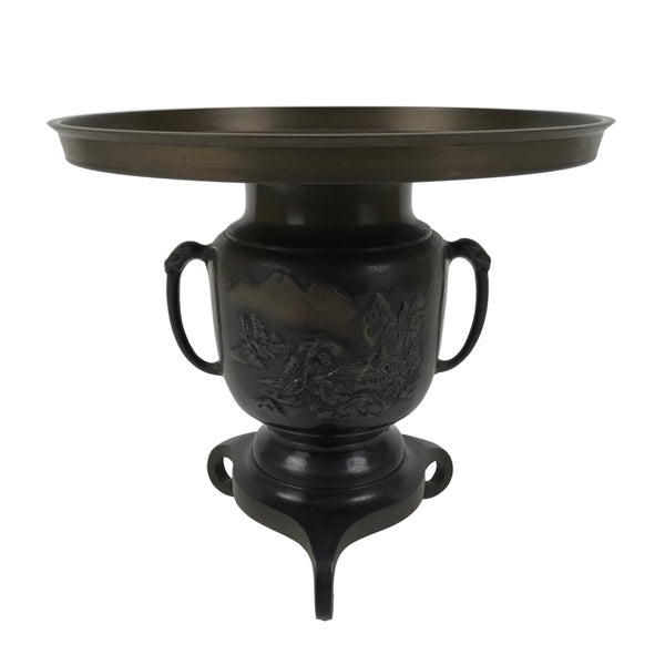 This is a usubata flower vase for ikebana flower arrangements, made of bronze . It consists of two pieces: a bottom stand with two handles and a removable flat saucer-shaped top. Standing on three legs, the base depicts a small house in a mountainous area on one side. The handles have a shishi head design.