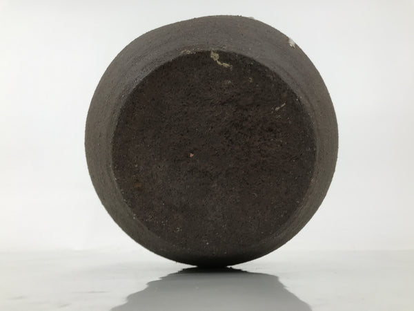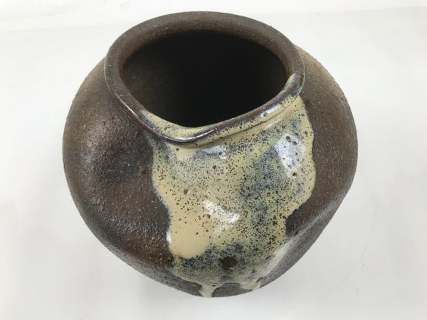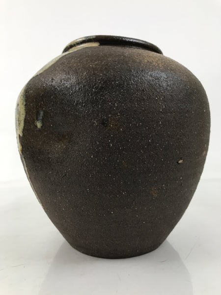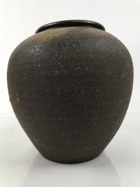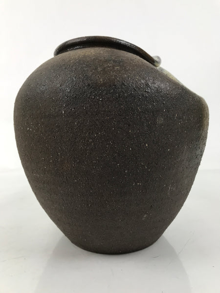 This is a vintage Japanese ceramic flower vase or kabin. This round pot-type vase is brown. It features an ash glaze and a rough-textured surface. Two indentations are around the top and middle of the body. It can be used for all flower arrangements, both ikebana and casual.