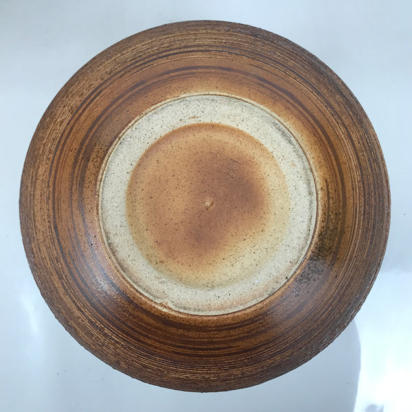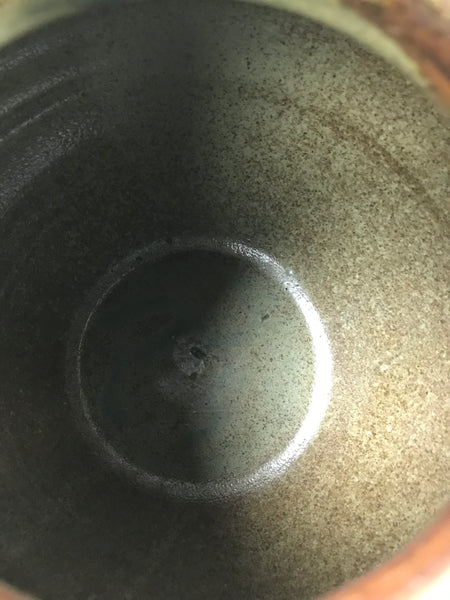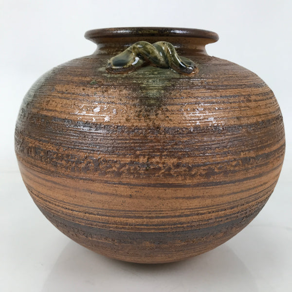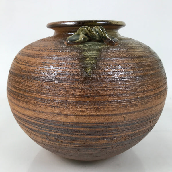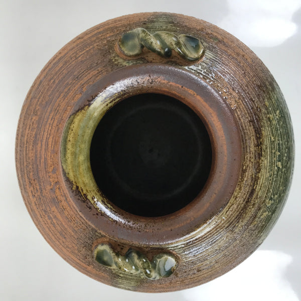 This Japanese vintage ceramic flower vase or kabin is brown with some green glossy glaze, a natural glaze or ash glaze made by ash during the burning process in the kiln. It is textured and has two decorative handles. This big vase is sold in a wooden box, perfect for storage when not on display. This vase can be used for Ikebana flower arrangement. It is an elegant piece, suitable for any season and ideal for any home or office.