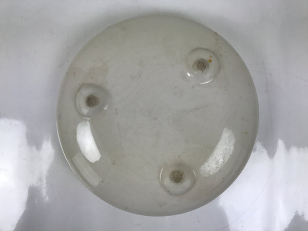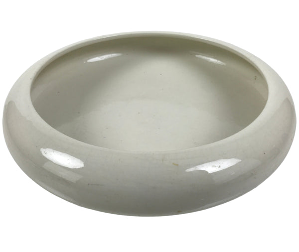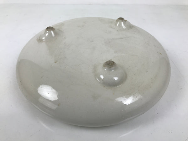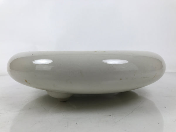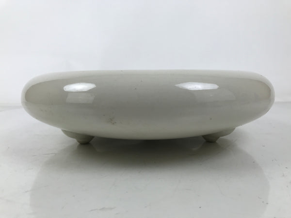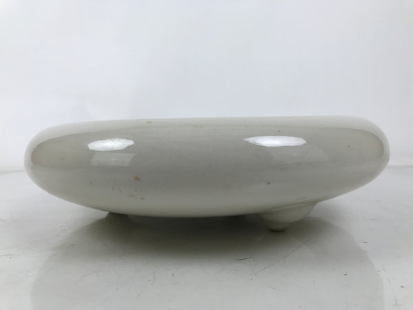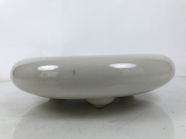 This is a vintage porcelain Japanese flower vase, or suiban. This piece is a round shallow bowl shape with a flat bottom. It is white with a smooth texture and three short decorative feet.