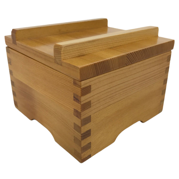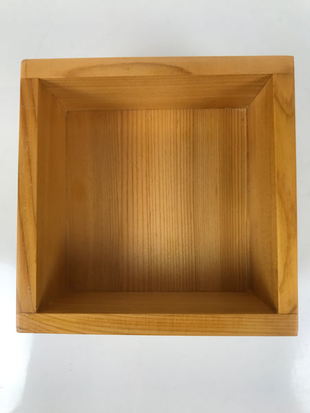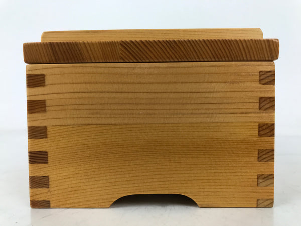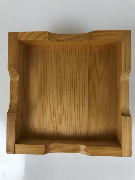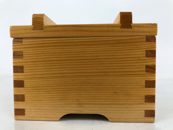 This is a vintage Japanese brushed lacquer wooden box with a lid. It is made of either cedar or cypress and brushed with a clear coat of lacquer to allow the fine natural wood grain to shine through. This piece is used as a serving dish for one of many small and elegant courses during a traditional kaiseki meal set.