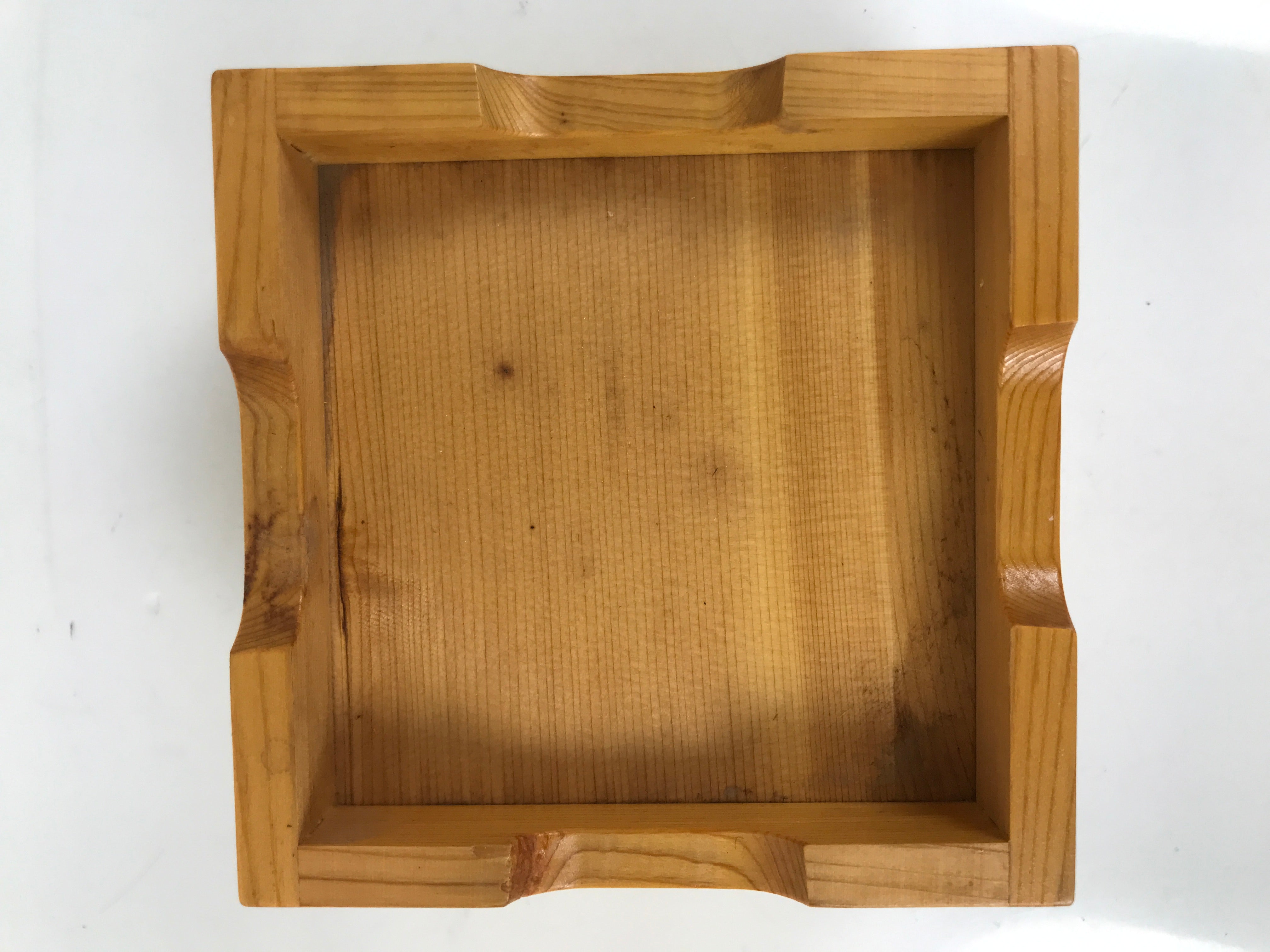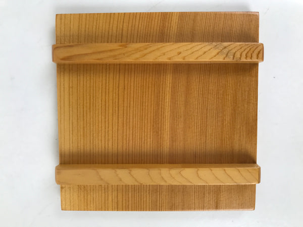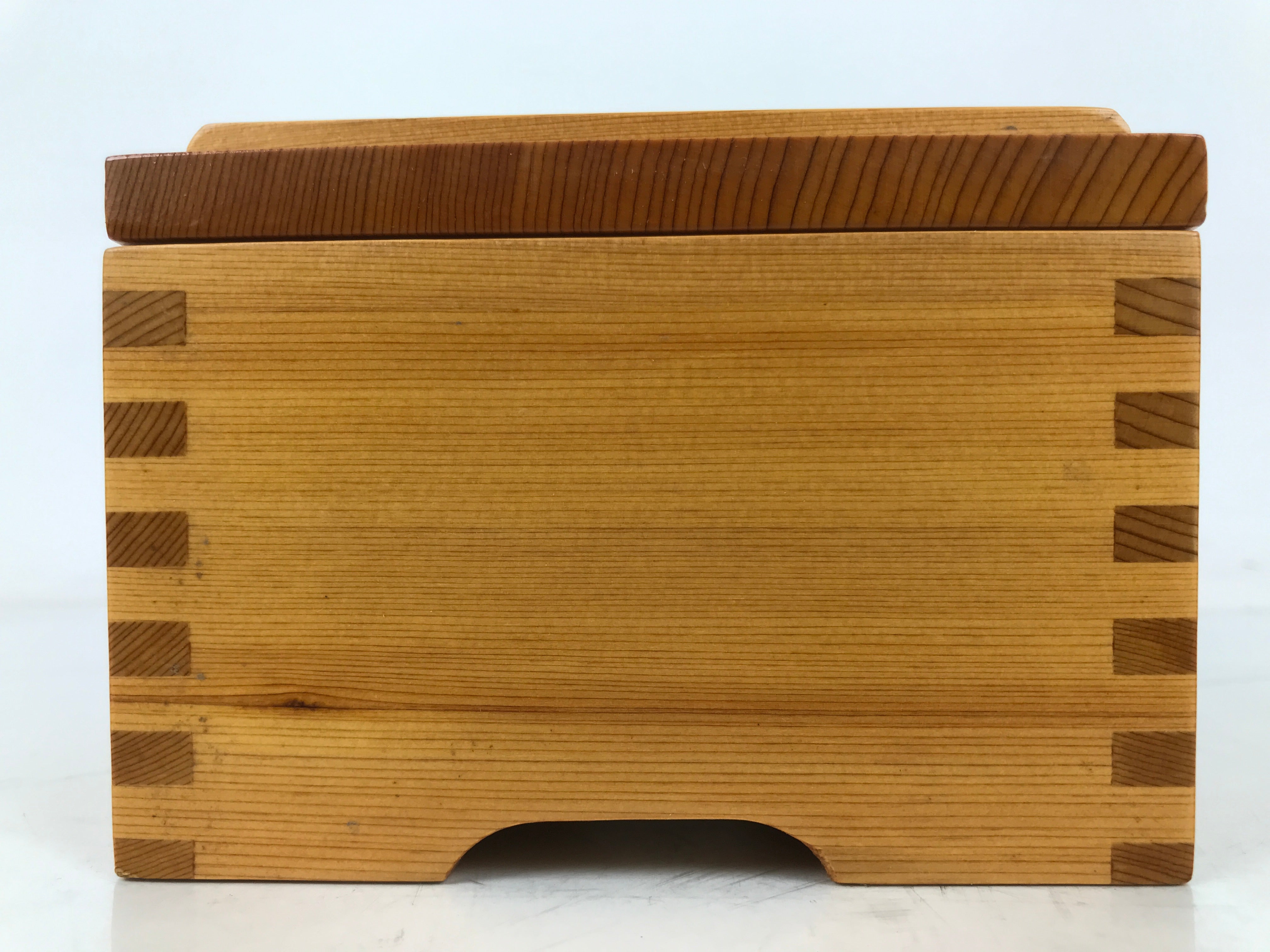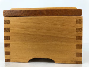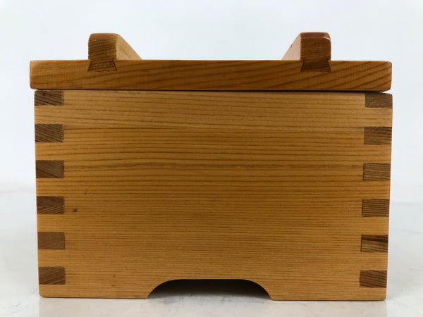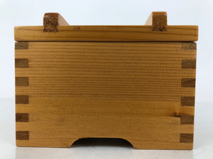 This is a vintage Japanese brushed lacquer wooden box with a lid. It is made of either cedar or cypress and brushed with a clear coat of lacquer to allow the fine natural wood grain to shine through. This piece is used as a serving dish for one of many small and elegant courses during a traditional kaiseki meal set.