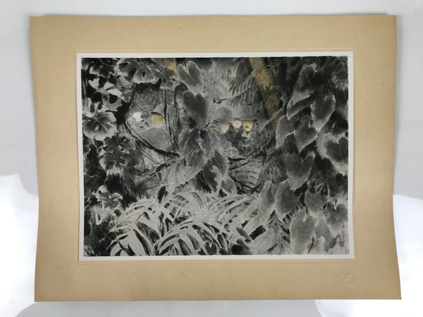 This is a vintage Japanese machine-printed reproduction of military art by Kawabata Ryushi. The piece is called 'The thorn jungle challenge'. It represents soldiers in the jungle. The piece is placed on a piece of cardboard with a protective sheet of paper on top, with the title and the name of the painter.