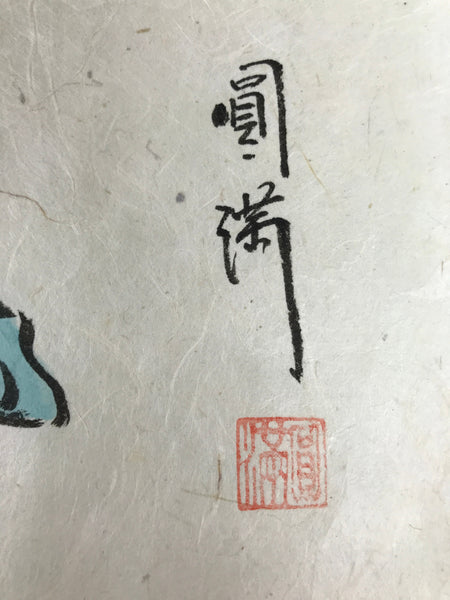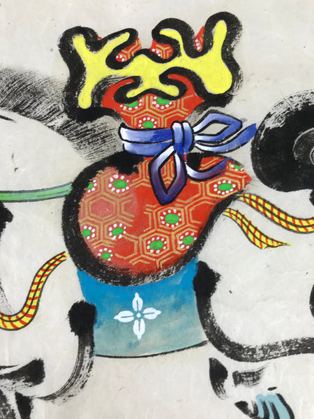 This vintage Japanese calligraphy painting features a white horse carrying a big red and yellow bag on its back. This type of horses is called ema, they are a symbol of good fortune. This piece is signed with a name and a red seal.