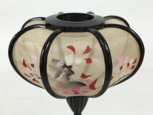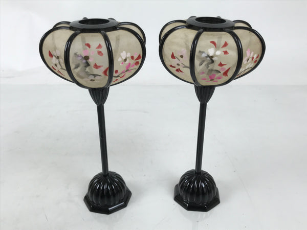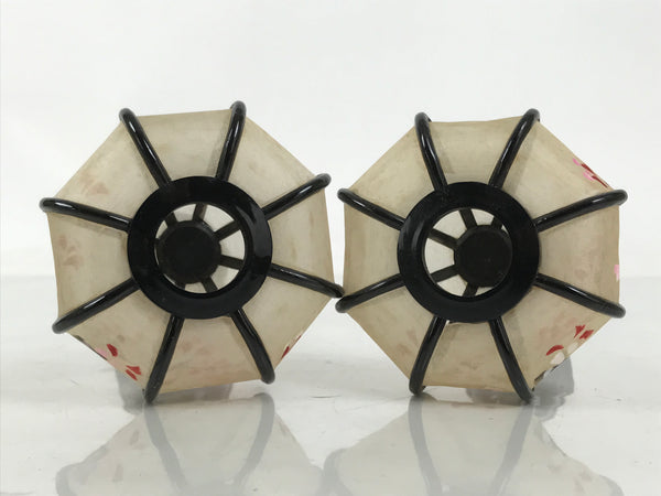 This is a vintage Hina doll furniture lantern set. A bonbori is a portable lamp traditionally used to light spaces during times without electricity (a lantern more decorative than a common brazier). This pair of lanterns sits at the top of a hina display at the ends. It is made entirely of resin and colored black. The lantern top is made of translucent white silk and has red and pink cherry blossoms hand-painted on it. It comes with the original paper box.