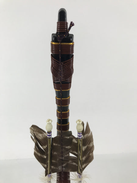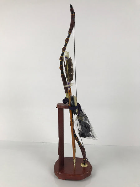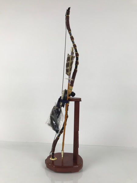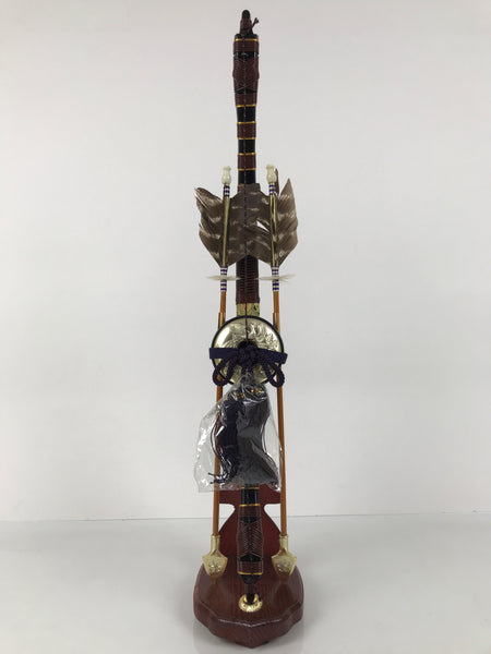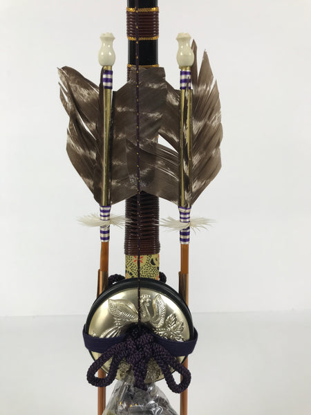 This set features a bow with arrows (Hamayumi) for display in one's home. Hamayumi is said to ward off evil spirits from the house and bring fortune. It is also a talisman for the healthy growth of children and is often displayed during the Boys' Day Festival (Children's Day) every May. It may complement the kabuto helmet often displayed during that holiday. This set features a combination of black and brown with golden details, along with a deep purple braided cord and tassel on the front. This item comes in a cardboard box.