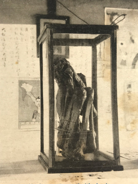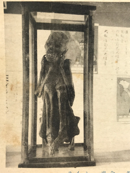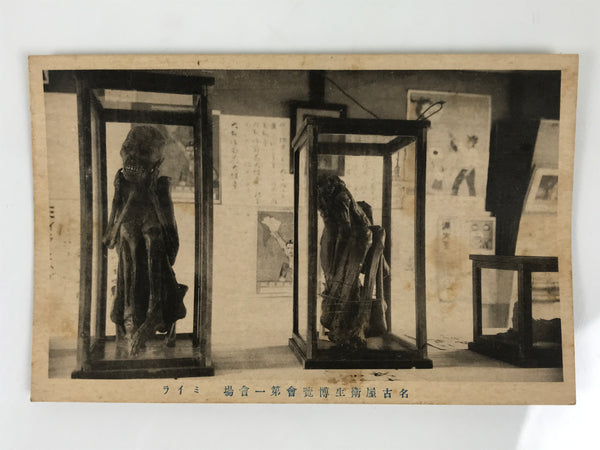This is a black-and-white vintage Japanese souvenir postcard of the Nagoya Hygiene Exhibition that took place in 1926 (Taisho 15). This postcard features mummies displayed behind glass cases.