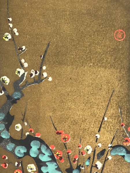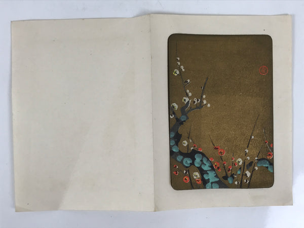 This vintage Japanese writing card features colorful woodblock-printed artwork representing a Japanese plum tree (ume) with red and white blossoms on a gold plain background. The artwork can be removed from the paper card. The inside of the card has light blue cranes printed on it. The card paper is folded in four.