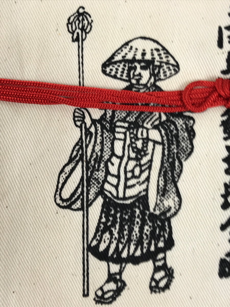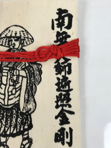 This vintage Japanese fabric pouch is called osaisen ire, a small bag for storing the coins people offer at shrines and temples. This pouch is beige with a black illustration of Kukai, a Japanese monk who founded the Shingon school, with his name printed on the right. The bag has a red string attached.