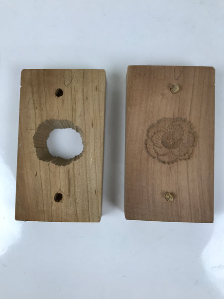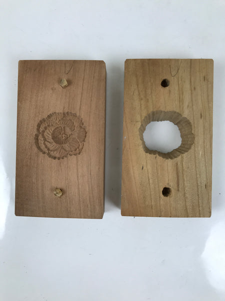 This two-panel kashigata mold is carved with the design of a small peony flower (botan). Peonies are one of the main floral motifs in Japanese traditional design and symbolize prosperity, good luck, and protection. This mold can be used to make sweets or as an eye-catching decorative item.