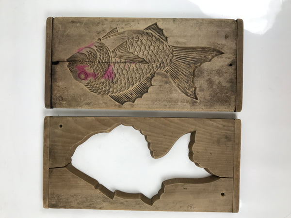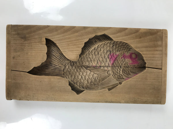 This two-panel kashigata mold is carved with the design of a sea bream fish (tai or madai). Served often in celebratory meals, this vibrant red fish symbolizes good luck. This mold can be used to make sweets or as an eye-catching decorative item.