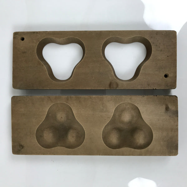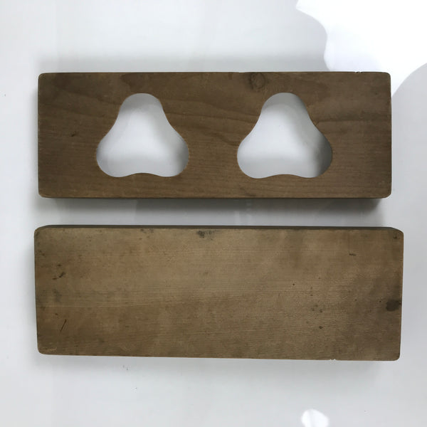 This two-panel kashigata mold is carved with the design of two rounded triangular mon crest symbols for a Buddhist temple. This mold can be used to make sweets or as an eye-catching decorative item.