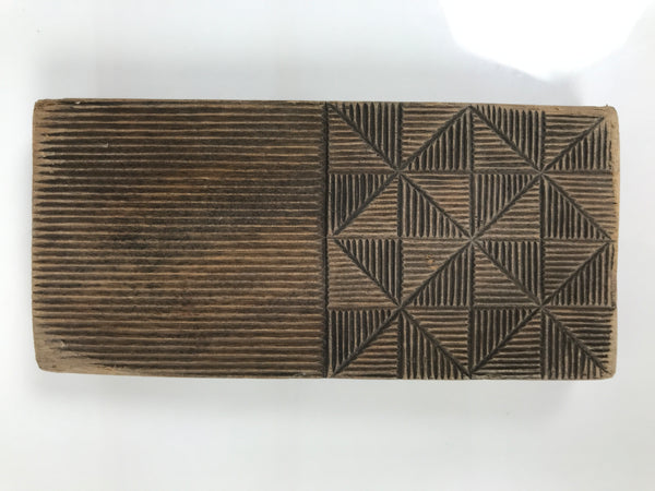 This single-panel kashigata mold is carved with two different line patterns: a simple horizontal/vertical line and a triangle checkerboard-style line design. It is used with other simple kashigata molds as a patterned back plate. This mold can be used to make sweets or as an eye-catching decorative item.