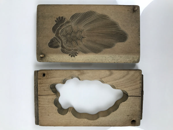 This two-panel kashigata mold is carved with the design of a Japanese turtle (kame/minogame). Minogame are legendary turtles that sport tails made of seaweed. They are said to be symbols of longevity. This mold can be used to make sweets or as an eye-catching decorative item.