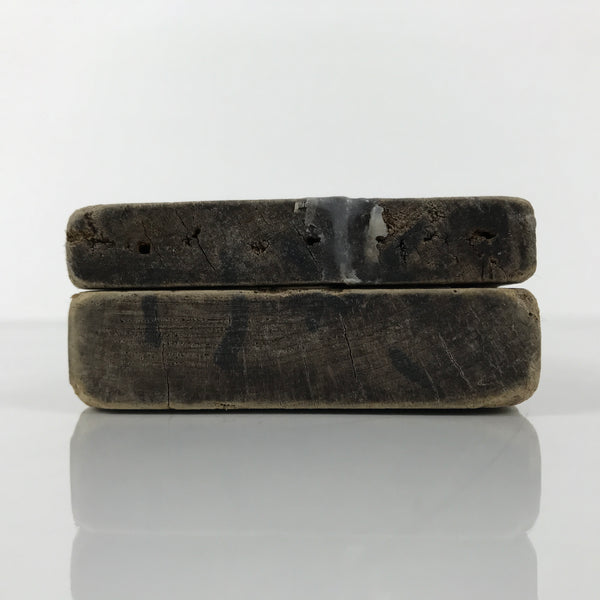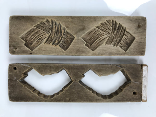 This two-panel kashigata mold is carved with the design of a pair of tied knots of kelp (kombu). Kelp in Japanese cuisine symbolizes good fortune and happiness and its similarity to the word yorokobu which means "happiness" or "celebrate". As such, kombu is often incorporated into meals of celebratory nature in some manner. This mold can be used to make sweets or as an eye-catching decorative item.