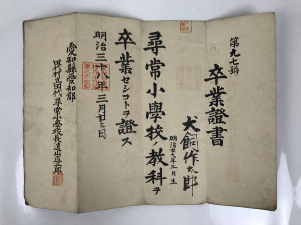 This antique Japanese elementary school graduation certificate, dated Meiji 38 (1905), belonged to a student attending school in Aichi prefecture.