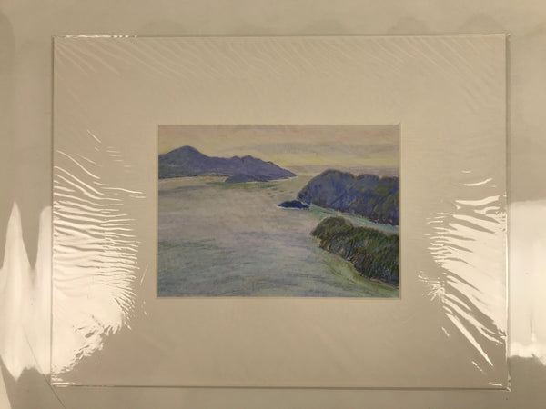 This original pastel drawing on cardstock paper features a landscape of a coastal inlet at dawn. Pastel is a gorgeous, often overlooked, art medium that blends colors together beautifully and this piece is no exception. It is adhered to a plain white matboard, ready for easy framing and is stored in a plastic sleeve. This work is unsigned, but was among a collection of similar drawings by the Japanese artist Yoshihiro Hagino.